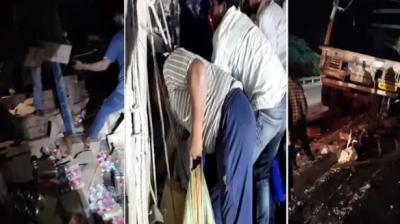 ट्राला दुर्घटनाग्रस्त होते ही शराब की लूट, रोकने गई पुलिस टीम पर बरसे पत्थर