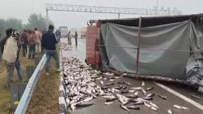 पलटा पिकअप, बिखरी मछलियाँ और मच गया हड़कंप