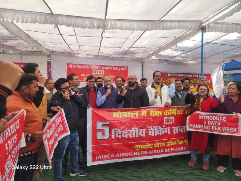 भोपाल की सड़कों पर उतरे बैंक कर्मचारी, सरकार से की पाँच दिवसीय सप्ताह की अपील