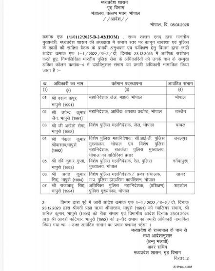 IPS अधिकारियों को नई जिम्मेदारियां, एमपी में बड़ा प्रशासनिक बदलाव
