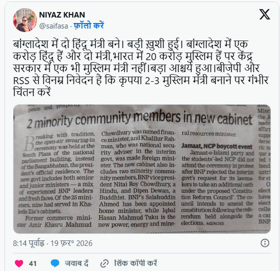 इनता ही नहीं मध्य प्रदेश के पूर्व आईएएस अधिकारी नियाज़ खान ने भी अपने एक्स अकाउंट पर पोस्ट में लिखा है ‘बांग्लादेश में दो हिंदू मंत्री बने. बड़ी ख़ुशी हुई. बांग्लादेश में एक करोड़ हिंदू हैं और दो मंत्री,भारत में 20 करोड़ मुस्लिम हैं पर केंद्र सरकार में एक भी मुस्लिम मंत्री नहीं. बड़ा आश्चर्य हुआ. बीजेपी और RSS से विनम्र निवेदन है कि कृपया 2-3 मुस्लिम मंत्री बनाने पर गंभीर चिंतन करें।